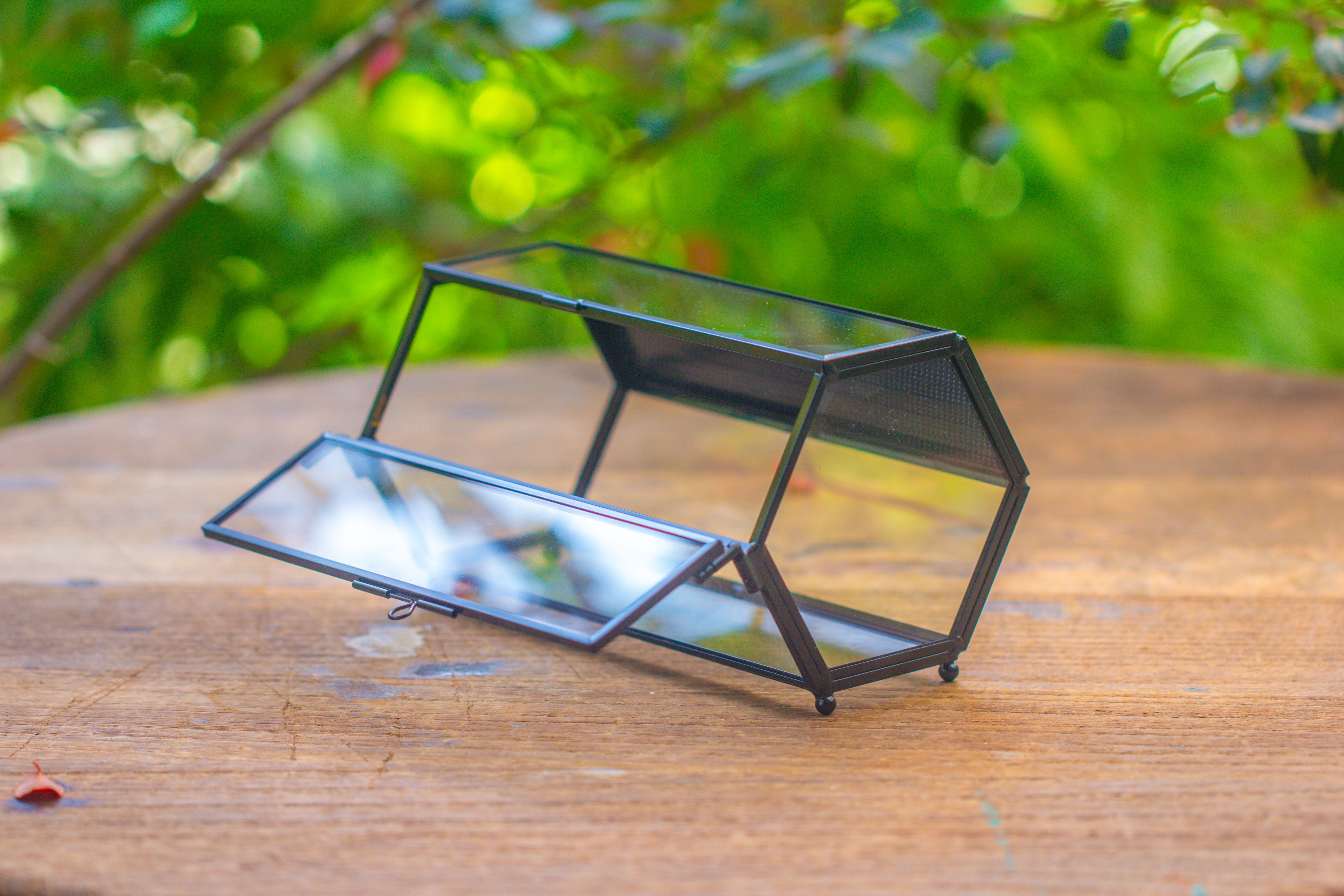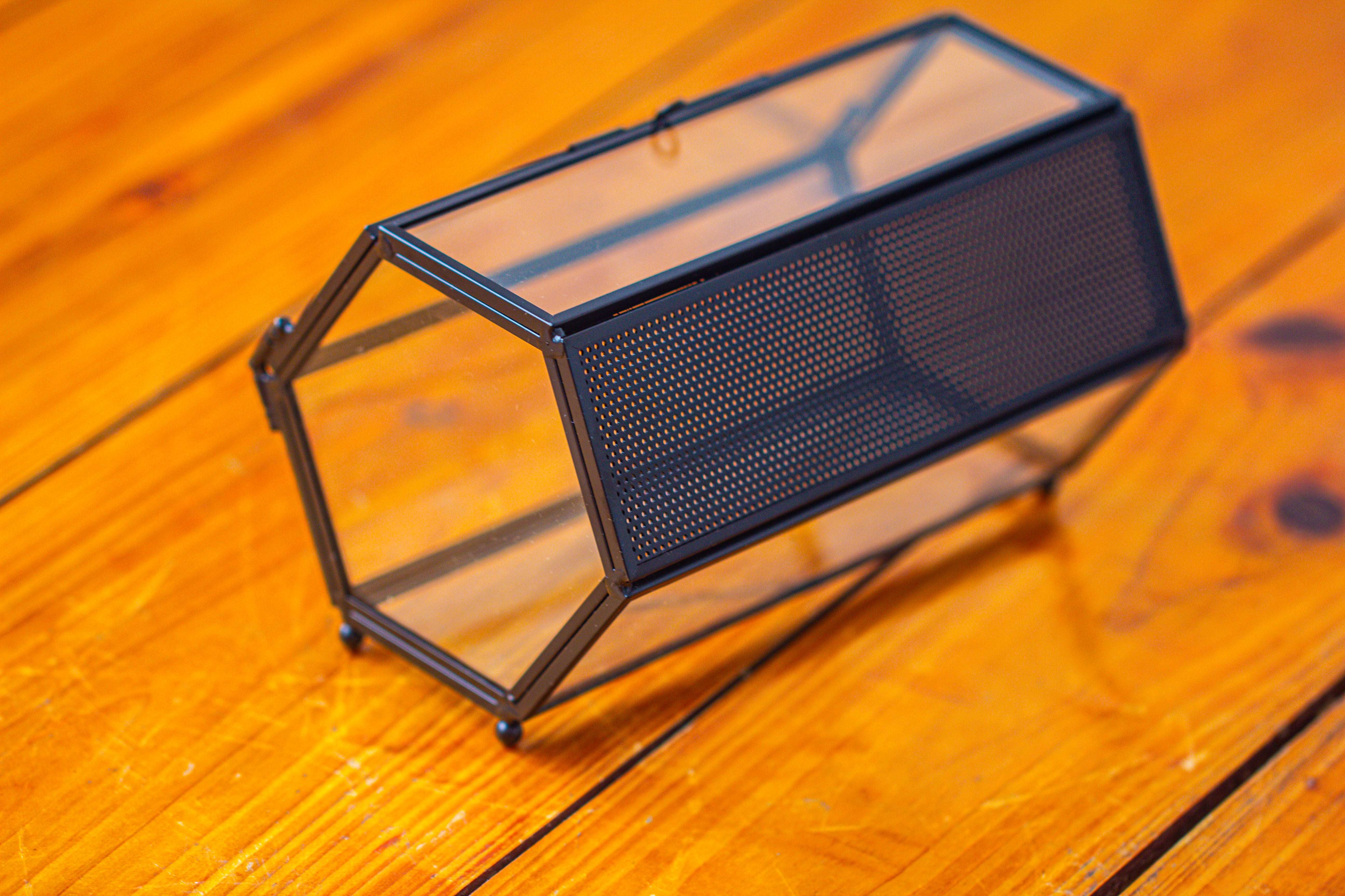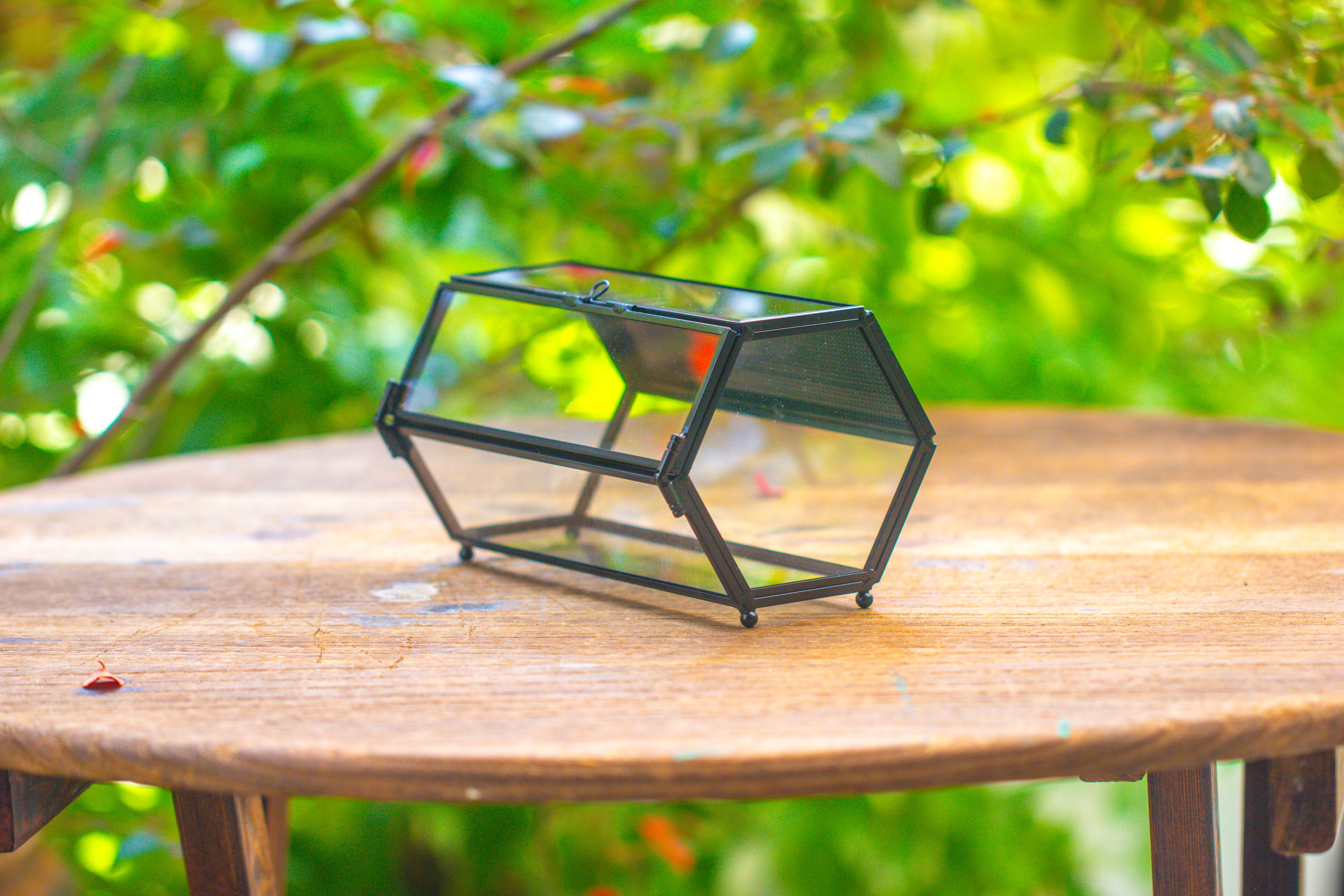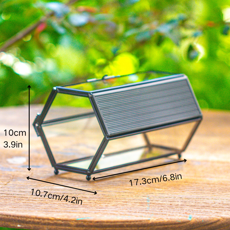 1.  This is a super mini  hexagon black insect terrarium is crafted from stainless steel, ensuring it does not rust. It features a stainless steel mesh vent panel, with a side door.