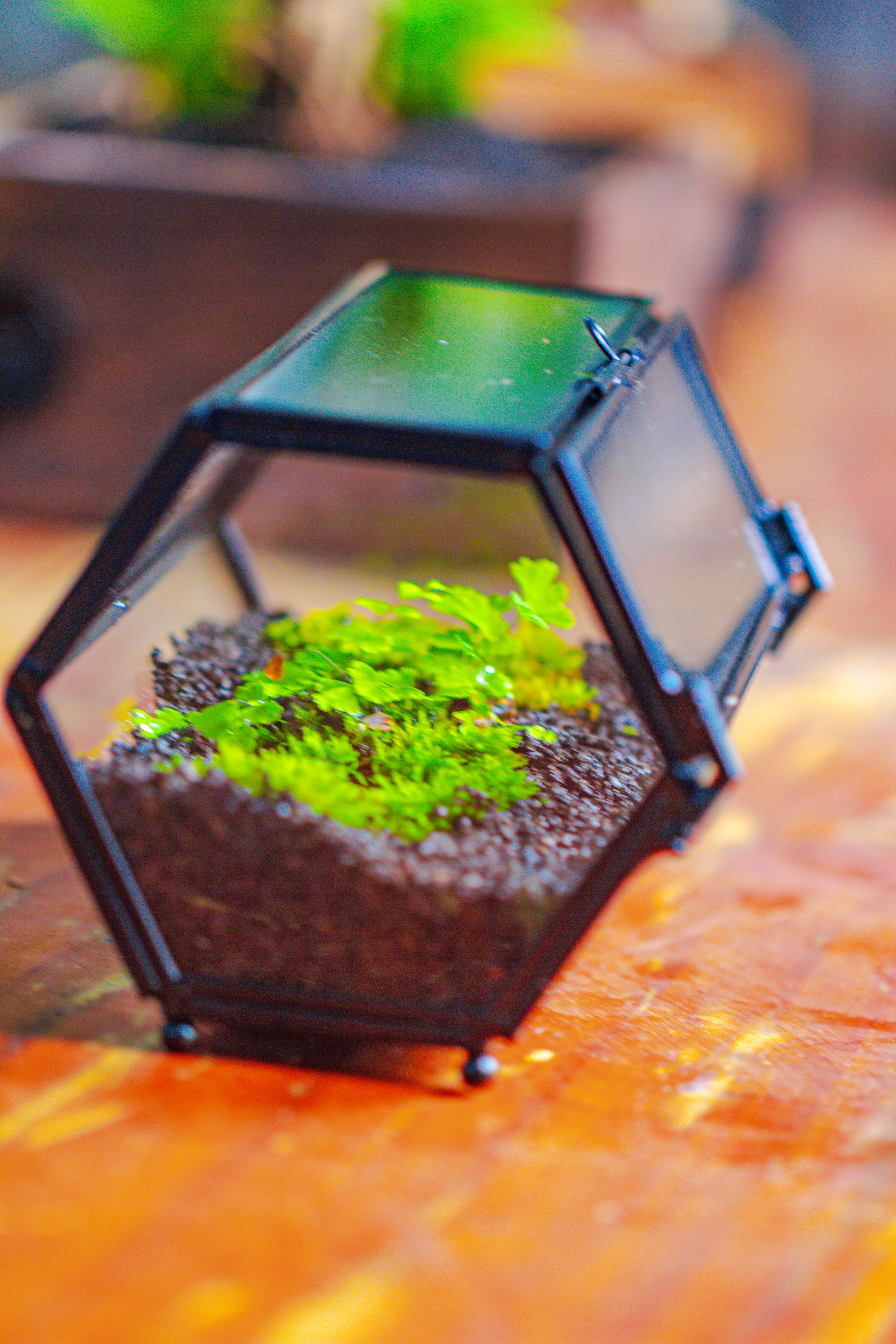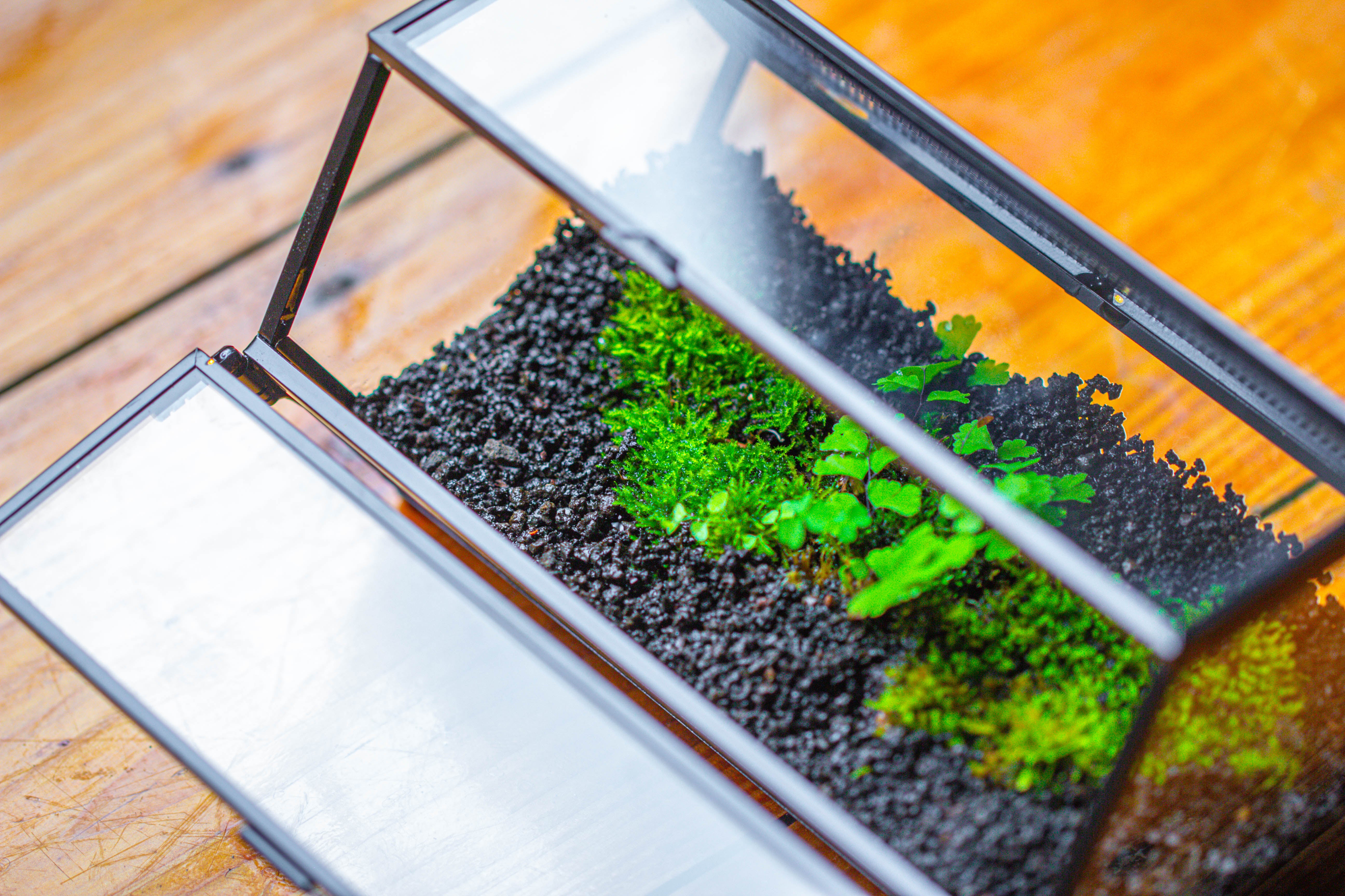 2.  This is a mini terrarium. It suits for small insects like jumping spiders.  As the photos show, Moss and small rocks is the best choice. The maiden hair fern is a super small wild one collected from my flower pot.