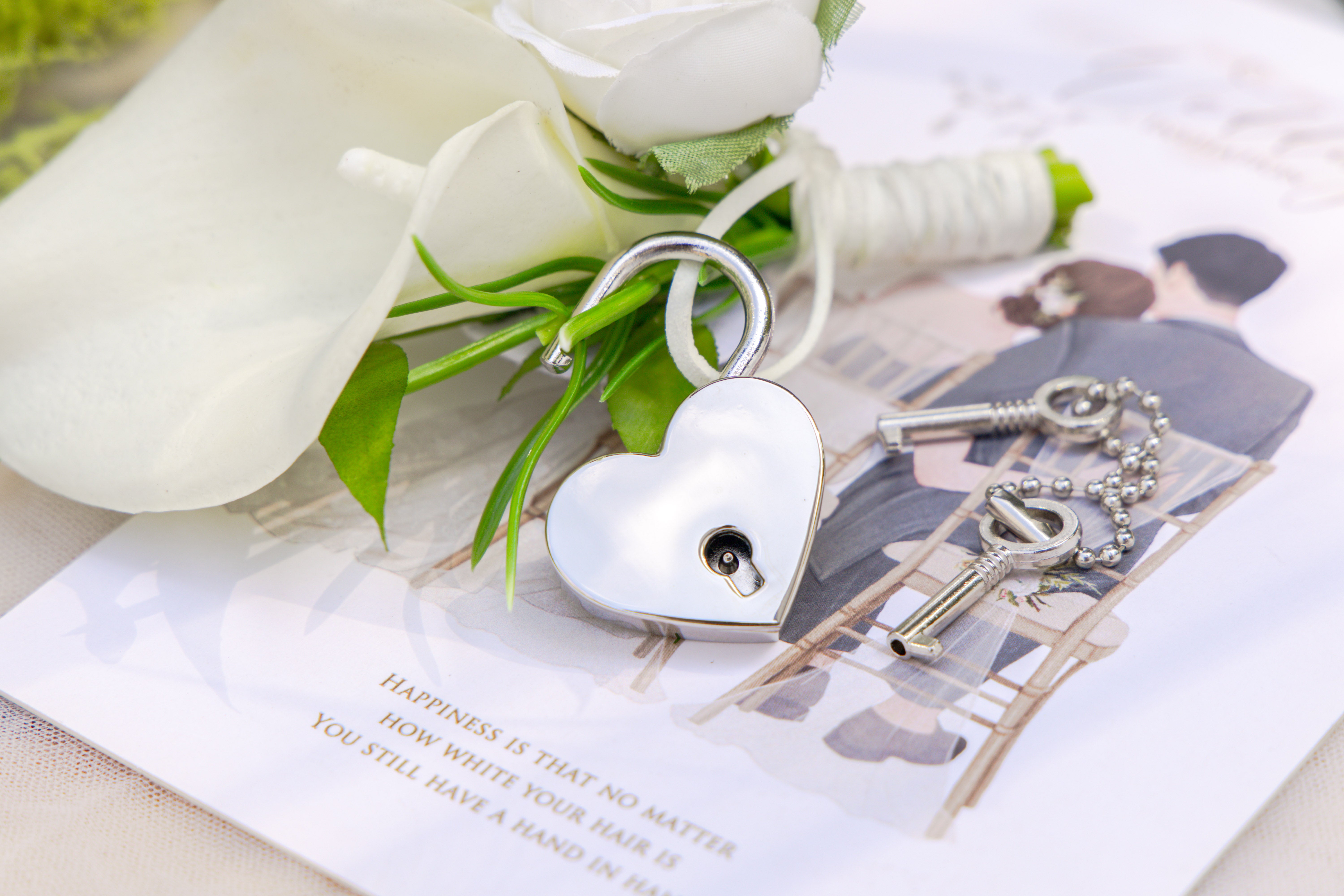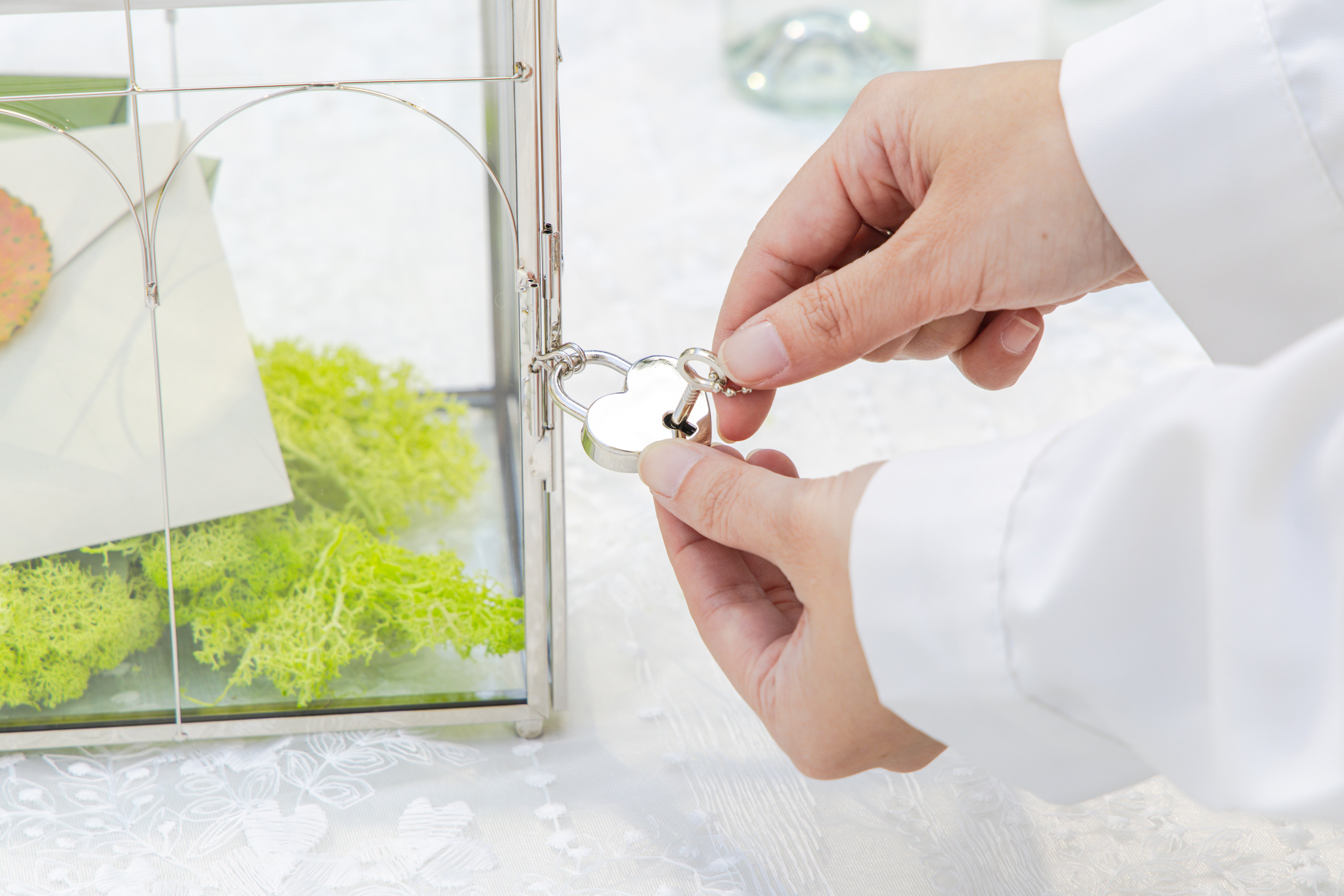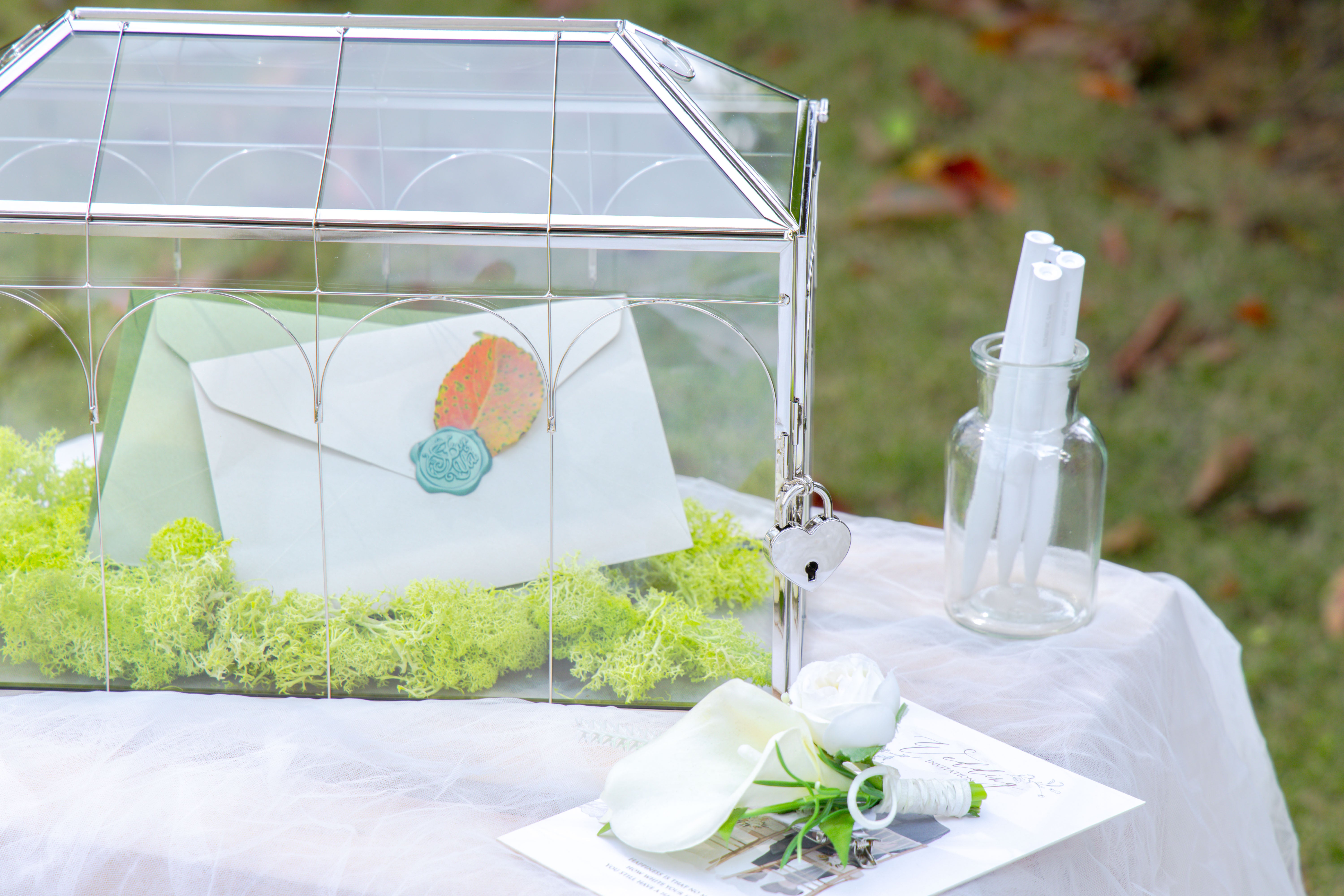 3. 前面の屋根にスロットがあり、側面にロック可能なドアがあります。ハート型の鍵付きロックが付属しており、中身を安全に保管できます。受付テーブルでカードを集めたり、願い事を書いたりするのに最適です。
