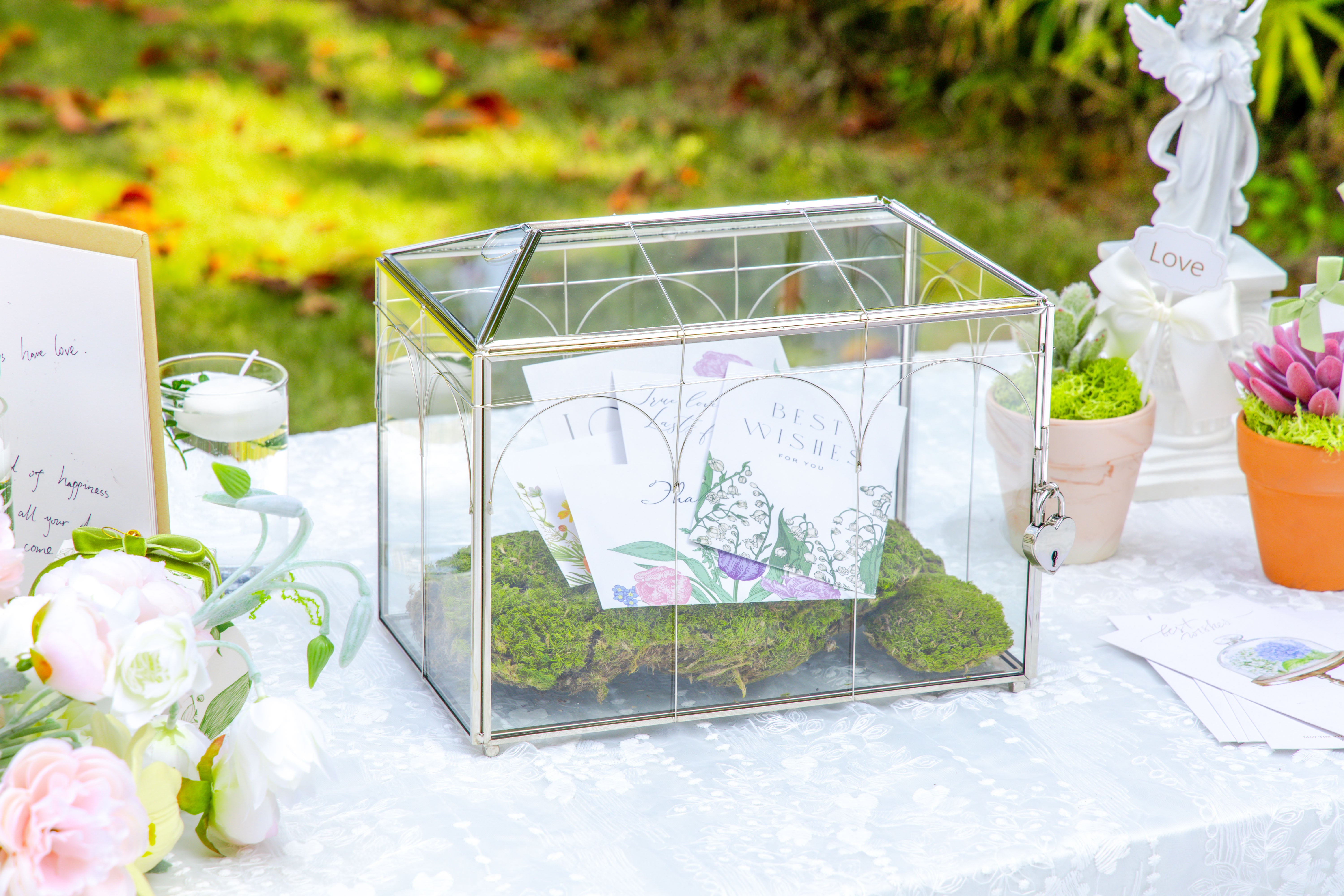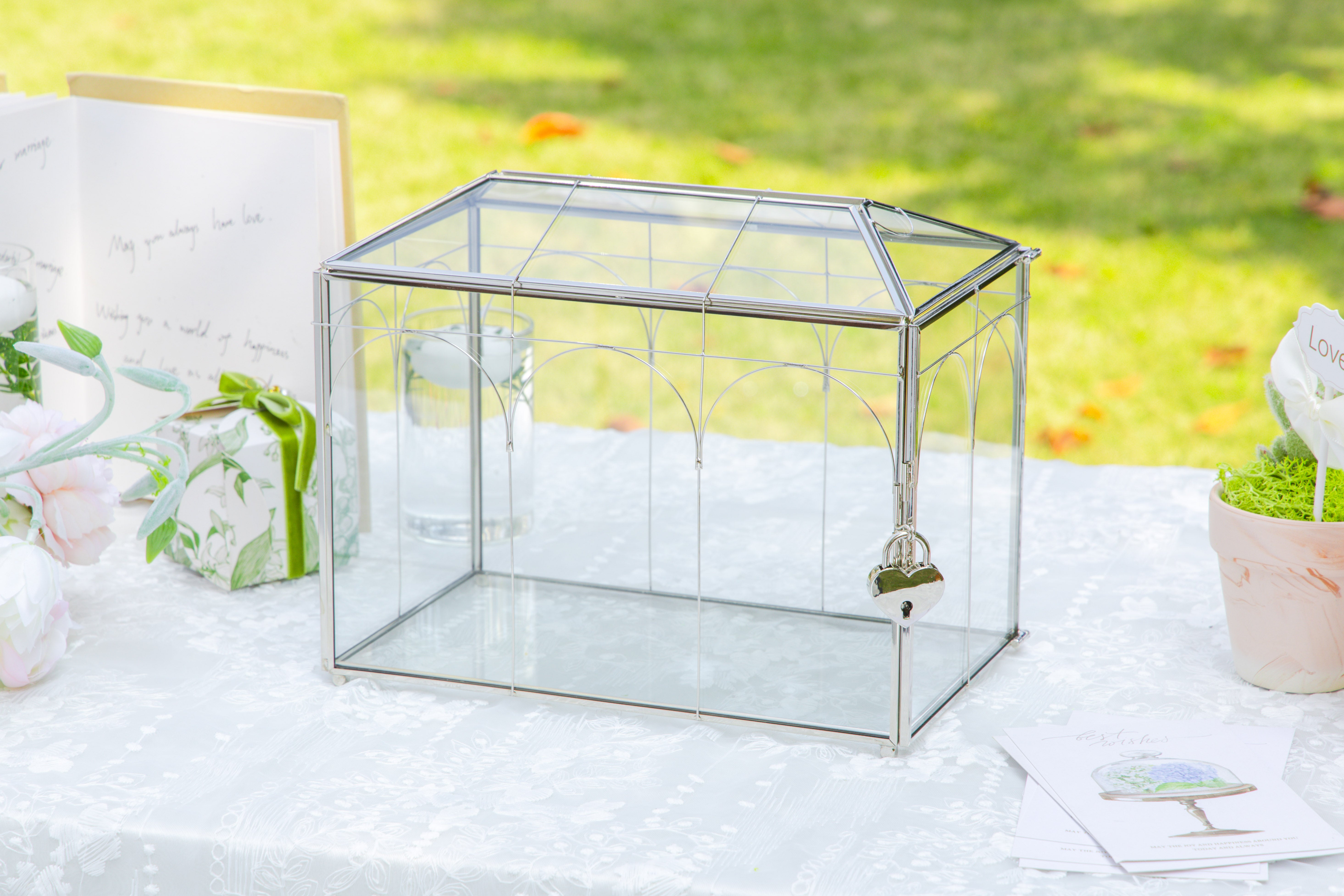 3. 前面の屋根にスロットがあり、側面にロック可能なドアがあります。ハート型の鍵付きロックが付属しており、中身を安全に保管できます。受付テーブルでカードを集めたり、願い事を書いたりするのに最適です。